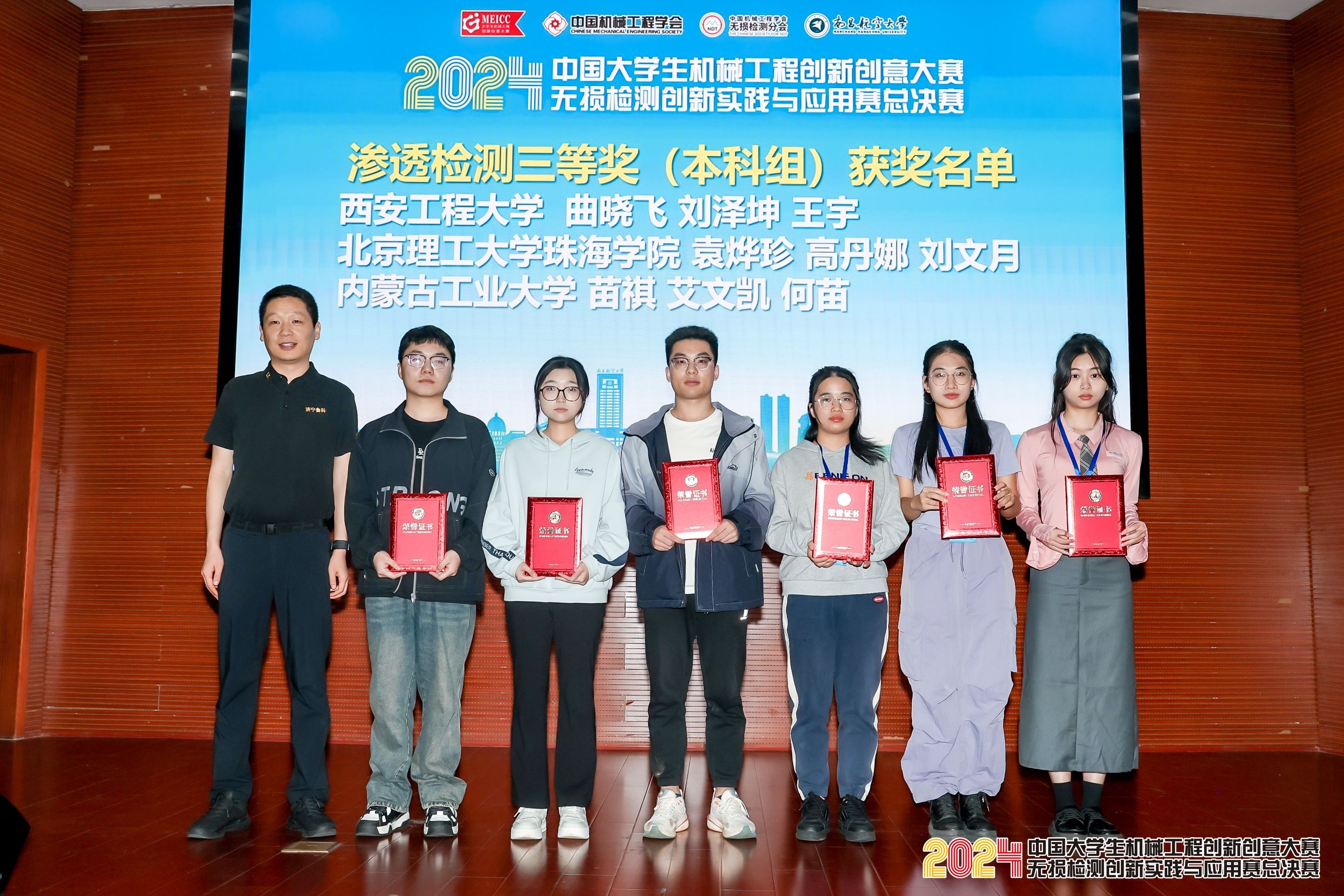 大賽頒獎環(huán)節(jié),濟(jì)寧魯科薛建祥總經(jīng)理為滲透檢測獲獎學(xué)生頒獎,并合影留念。